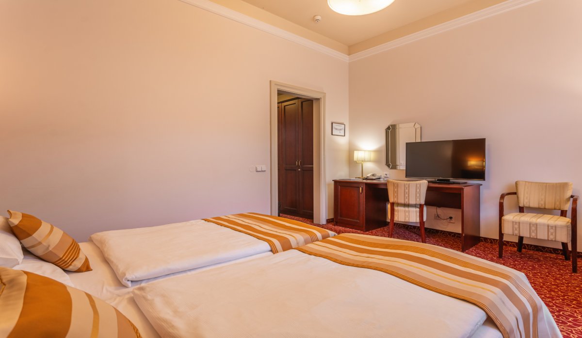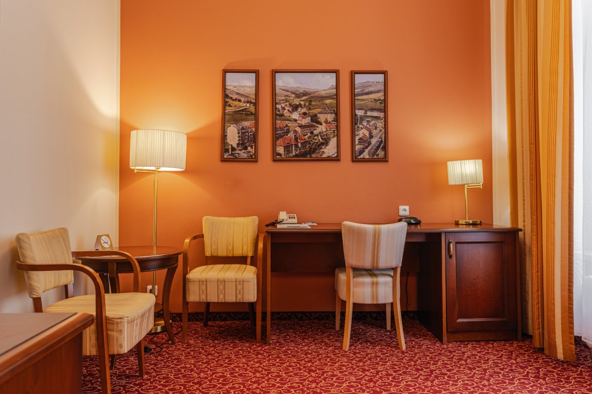 • Doppel- und Einzelzimmer Kat. Superior Plus: helle und geräumige Zimmer mit Aussicht ins Tal, Radiowecker, eingebauter Tresor, Computer mit Internetanschluss, Badewanne,  Bidet, täglich eine Flasche Mineralwasser Vincentka (0,7 l) im Zimmer, Verpflegung erfolgt im Blauen Restaurant