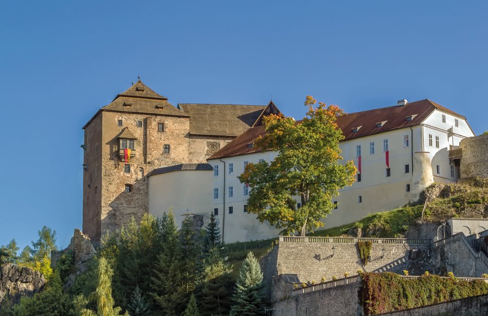 Auf einem hohen Felsen über dem Tal der Tepl liegt die interessante Anlage, die aus der Vereinigung einer mittelalterlichen gotischen Burg mit einem Barockschloss aus dem 18. Jahrhundert hervorgegangen ist.