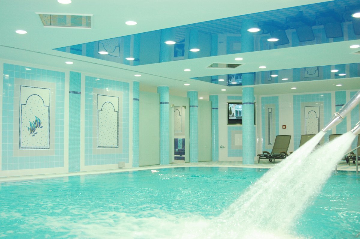 Pool mit Whirlpool (Größe 13 m x 7,5 m, Temperatur ca. 32°C), 2x Sauna, Sanarium, Nordic Walking, Power Plate, Kosmetikstudio und Laserzentrum, Frisörsalon, Fitnessraum