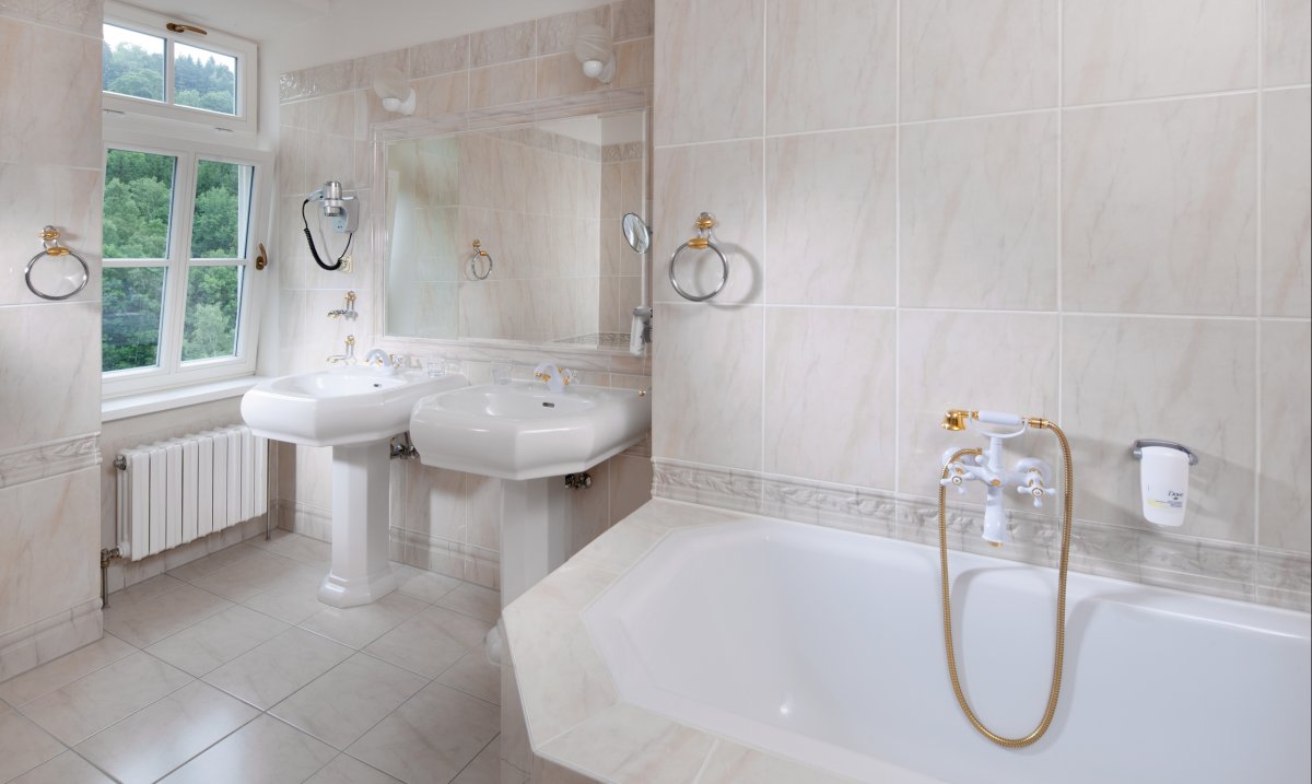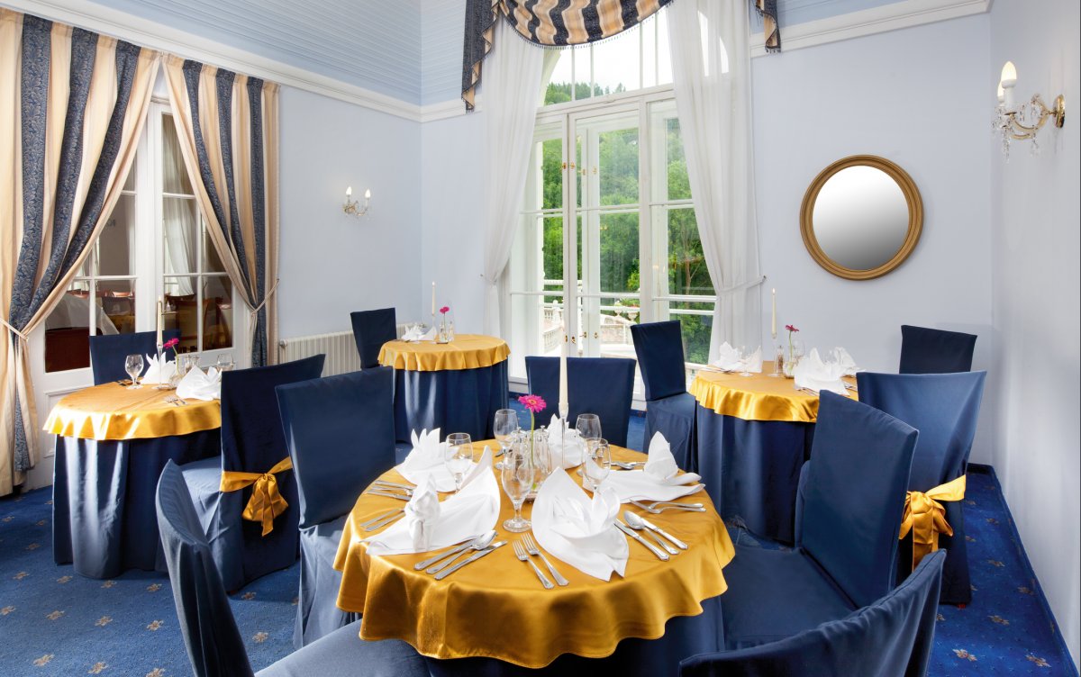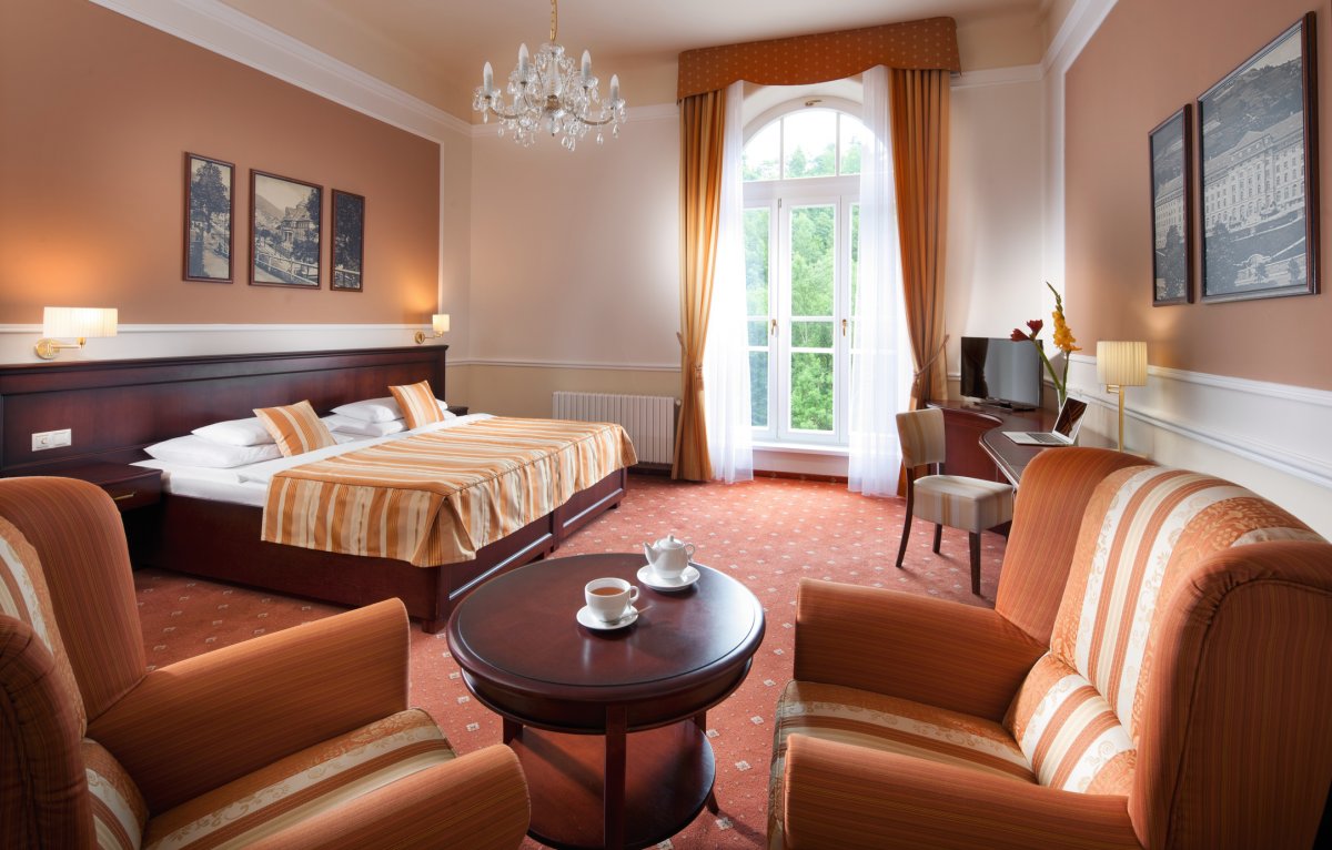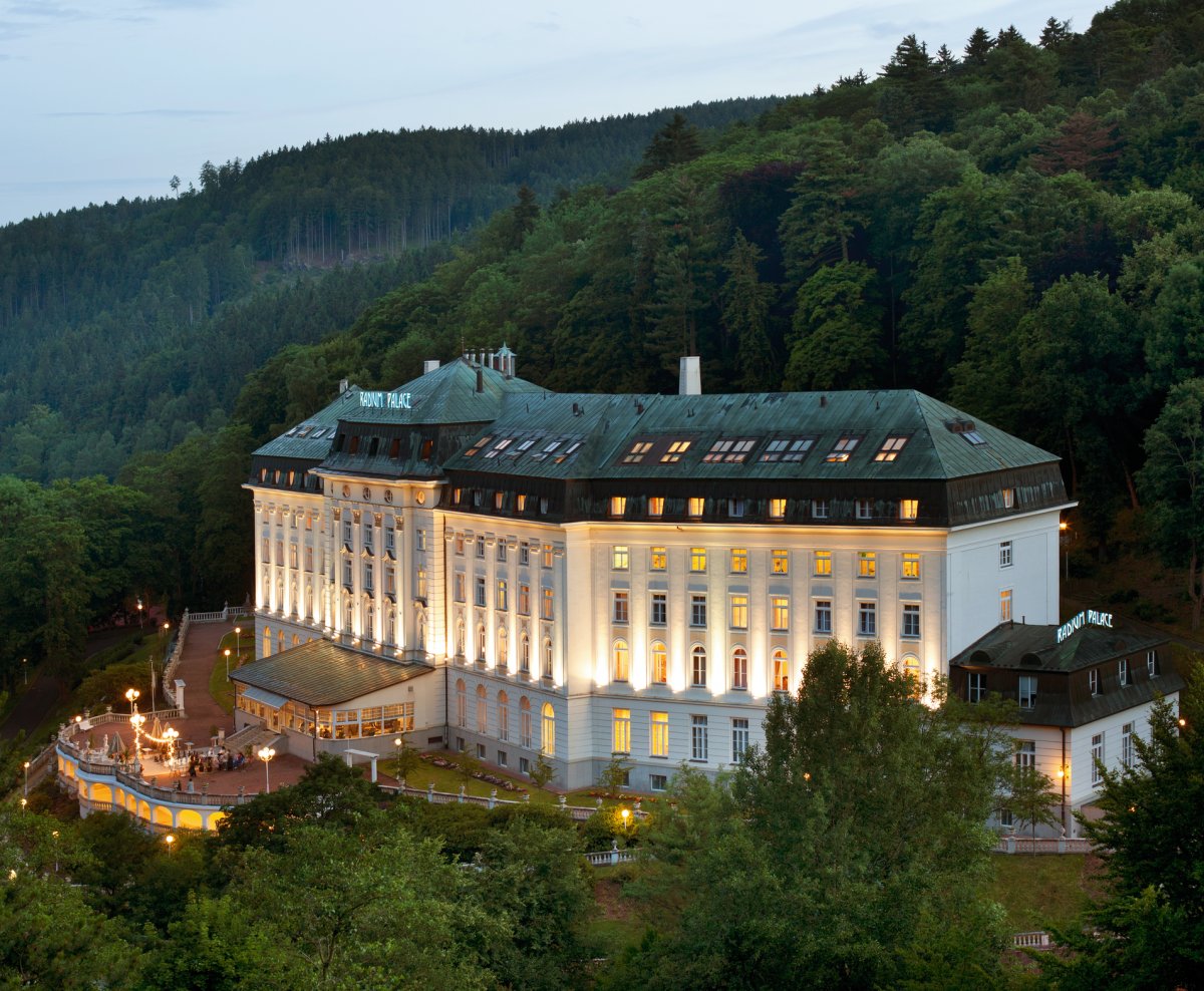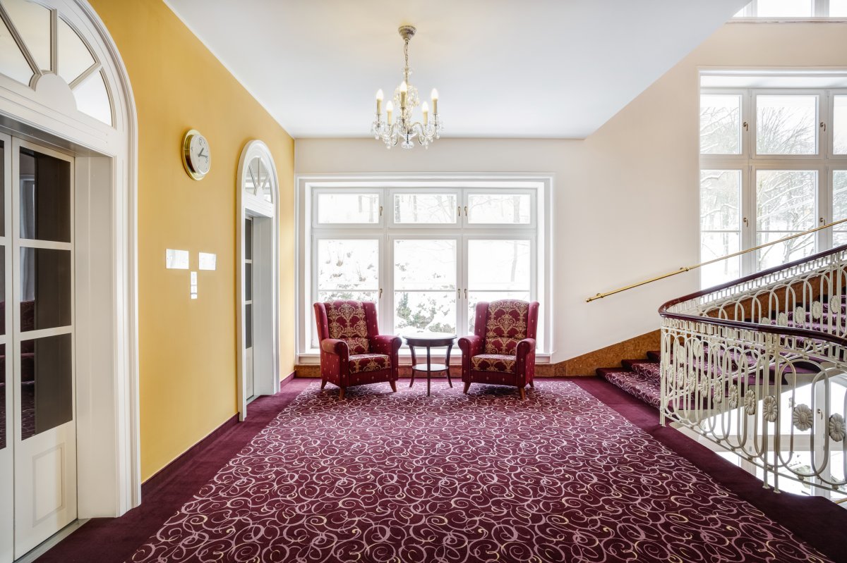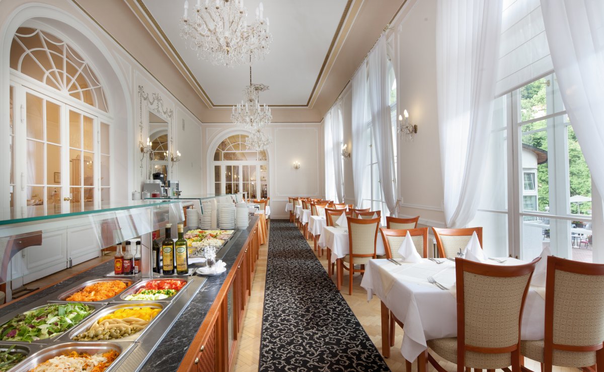 Das im Stil des Wiener Neoklassizismus erbaute Hotel ist malerisch inmitten eines Waldparks gelegen. Es wurde im Jahr 1912 eröffnet und im Jahr 1998 grundlegend renoviert und modernisiert. Dadurch hat es nichts von seinem luxuriösen Stil und Charakter verloren, die den Gast bereits beim Betreten des Hauses verzaubern. Das Hotel bietet gemütliche und komfortable Zimmer. In den 5 Restaurants wird ein breites Angebot an Speisen geboten. Nutzen Sie die großzügige Sonnenterrasse mit Blick auf den Park und das Erzgebirge und lassen Sie sich im verglasten Kaffee mit so mancher Leckerei verwöhnen. Die Kuranwendungen werden direkt im Hotel professionell durch bestens geschultes Personal durchgeführt und bewegen sich ebenso auf dem hohen Niveau des Hauses.